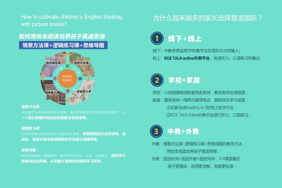 慧讀國際少兒英語,2009年牽手美國納斯達克上市的Cambium教育集團,引進分級閱讀ReadingA-Z授課平臺及APP,與全球三大英語語言教材開發(fā)商之一的MACMILLAN(麥克米倫)聯(lián)手開發(fā)適合中國孩子學習英語的教材——用繪本閱讀培養(yǎng)孩子英語思維。課程設置分為了“繪聲繪色”、“繪拼繪讀”、“繪詞繪句”、“繪文繪飾”、“繪寫繪閱”五個階段,分別解決了孩子聽說啟蒙及英語興趣培養(yǎng)、單詞拼讀、句型句式、語法時態(tài)、邏輯建立和深度閱讀及寫作等問題。慧讀國際將孩子帶入繪本情景中,以繪本為載體并運用了TPRS教學法,獨創(chuàng)的“情景方法課”、“邏輯練習課”,引入思維導圖,為自主閱讀與英語寫作打下了良好的基礎。